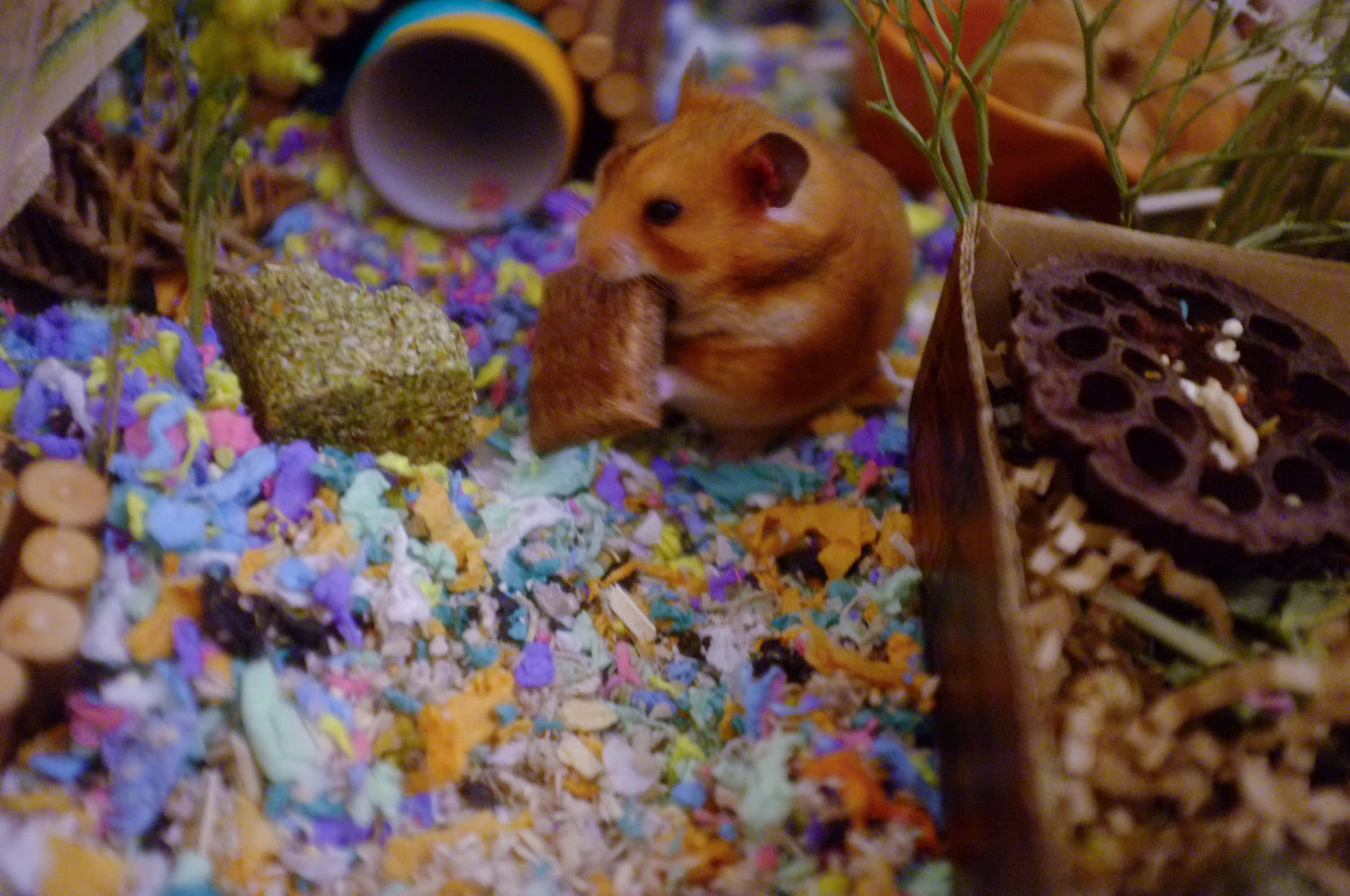 A calm and quiet hammy, the complete opposite of Ruby! Loves the Florida Gators and digging in his football-shaped coconut fibre dish